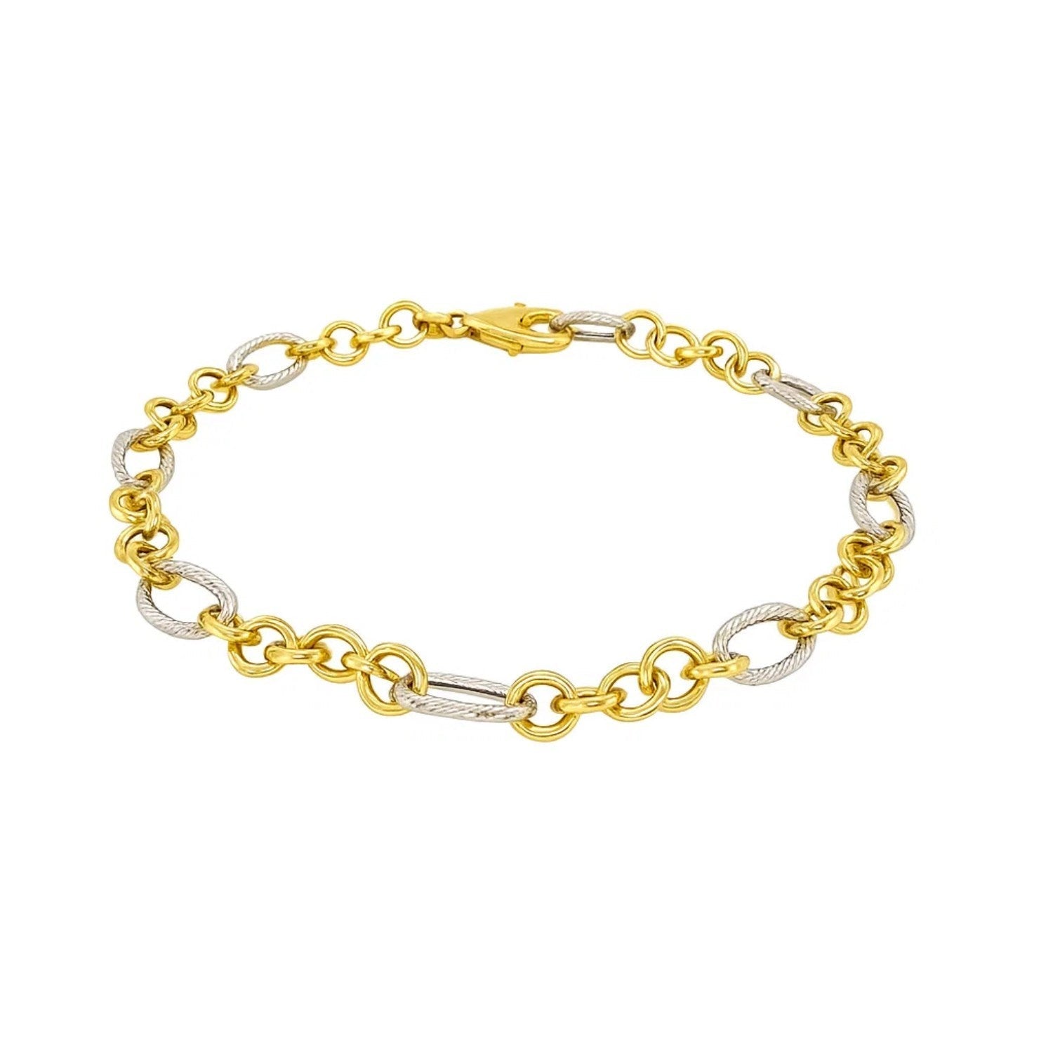 Finely crafted oval links with cable texture detailing complement the smooth round sections of this 14k two-tone gold chain bracelet. Comes in size 7 1/4 inches and secured with a lobster closure.