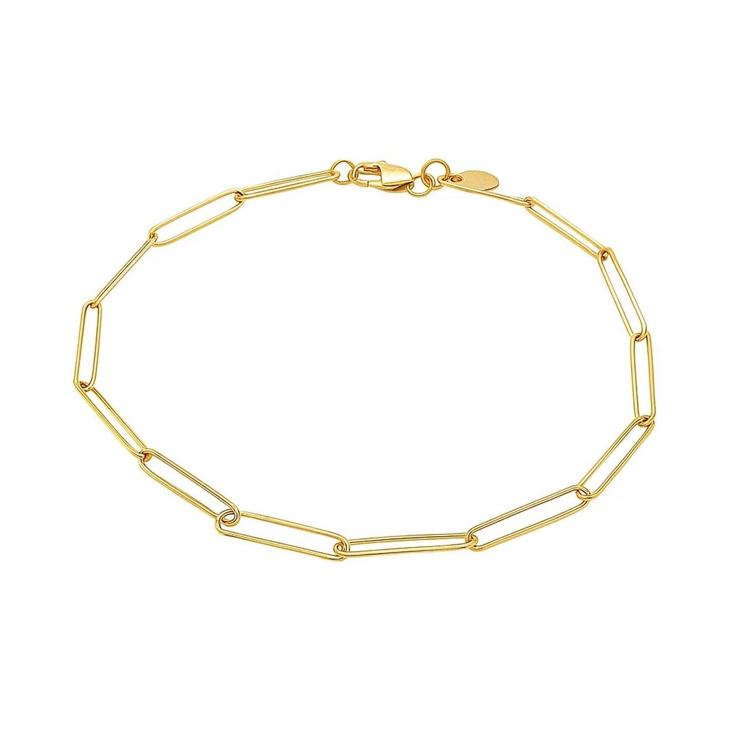 Bright 14k yellow gold is the star of this exquisite contemporary wire paperclip bracelet. Bracelet has 2.7mm wide links and closes with a lobster clasp.